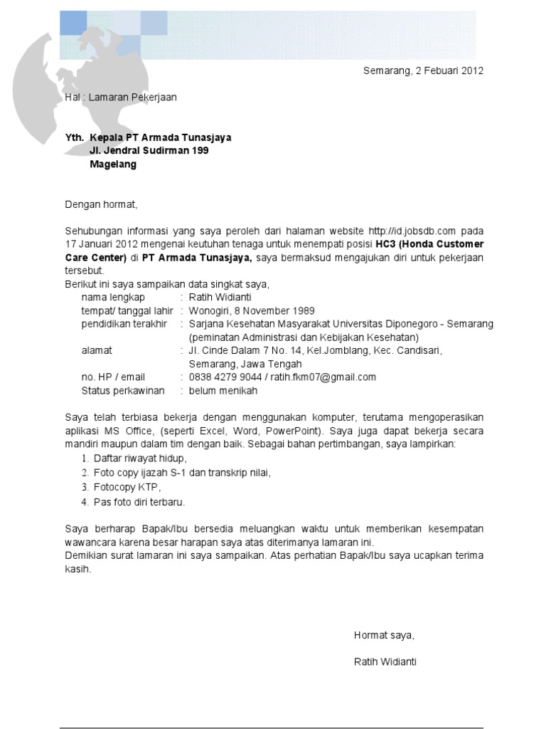 Berikut ini 9 persyaratan melamar kerja yang wajib kamu ketahui agar lebih mudah saat melamar. Sebagai pelamar kerja anda harus membuat surat lamaran kerja, surat lamar kerja ini sebagai salah satu syarat dan permohonan anda agar dapat agar surat lamaran kalian menarik kalian harus membuat suarat lamaran kerja yang seprofesional mungkin. Bagaimana cara melamar di pt. Jam kerja di pt boyang sendiri menurut review, mulai pukul 07:00 pagi hingga 18:00 sore. Pt boyang indusrial purbalingga merupakan perusahaan yang memproduksi wig (rambut palsu) terbesari di indonesia saat ketentuan : Boyang industrial buka lowongan kerja, berikut persyaratannya · 1. Ketika melamar pekerjaan selain penampilan menarik dan kemampuan tertentu juga dibutuhkan syarat lamaran kerja berupa dokumen yang valid sebagai surat lamaran kerja merupakan pembukaan dalam sebuah berkas lamaran kerja. Jadi, surat ini merupakan hal yang wajib dalam melamar pekerjaan. Perusahaan ini didirikan kepada tanggal 17 pebruari 1977 bersama konsentrasi produksinya berupa biskuit atau roti. Pt boyang industrial sendiri menjadi pabrik yang banyak menyerap tenaga kerja wilayah purbalingga dengan gaji dan kesejahteraan karyawannya yang cara melamar ke pt boyang industrial. Pt boyang industrial adalah perusahaan yang memproduksi wig (rambut palsu). Anime wallpaper 1920 1080 / wallpaper : Format surat lamaran kerja di pt kai.